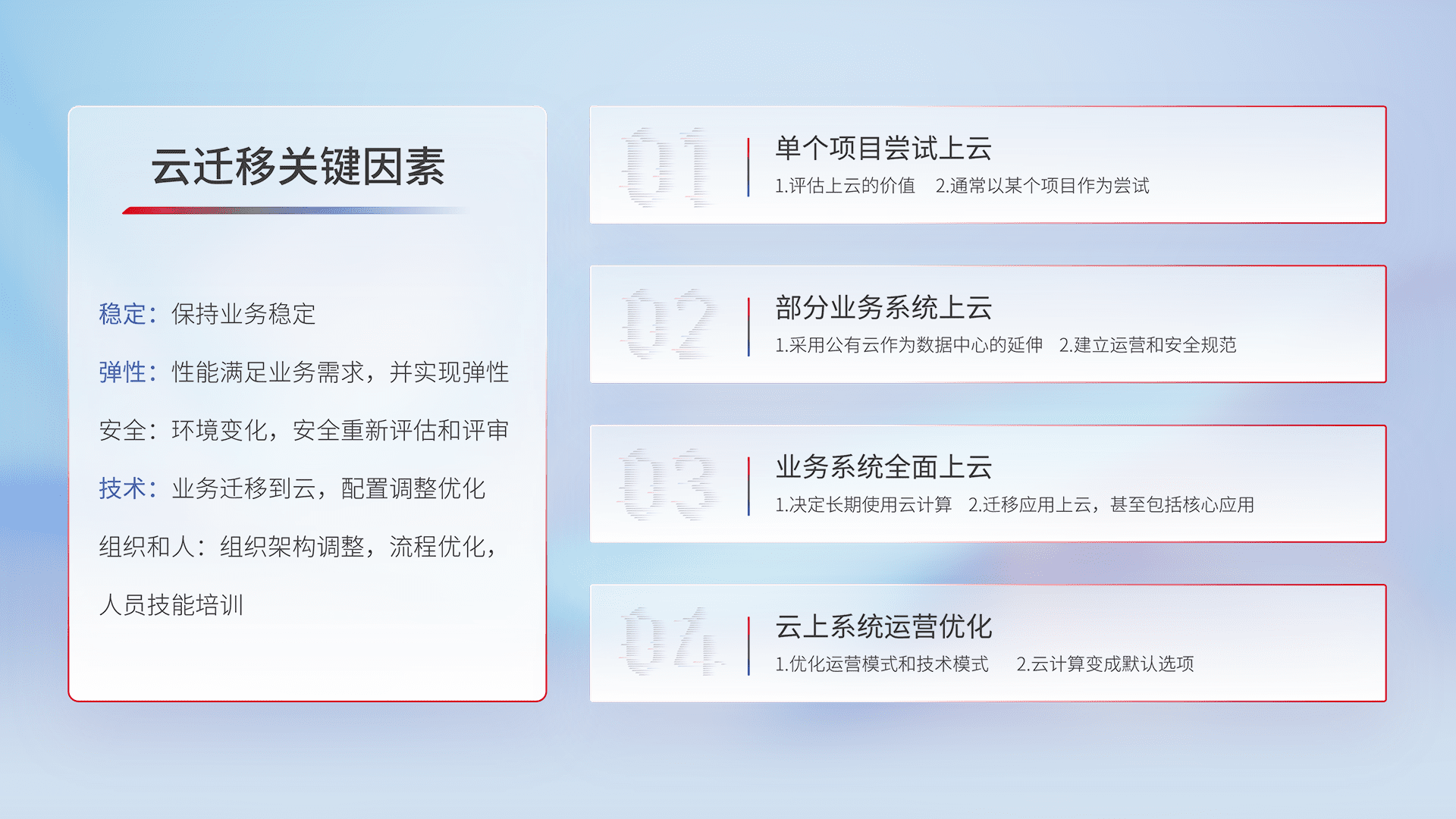 结合实际业务,,从规划设计、、、云平台选型、、、、云原生改造、、数据迁移、、集成交付,,,,迁移全过程为客户识别最佳上云路径,,,做好风险识别管理,,,,设计网络架构、、、身份权限、、安全审计合规、、、操作审计、、、、日志审计、、、、监控告警策略、、、多站点容灾设计等,,对云上基础设施进行整体规划,,,,提升IT治理水平,,以满足弹性、、、、高可用、、高性能的需求。。